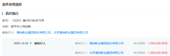 天眼查信息顯示,12月2日,博納影業(yè)及其子公司北京博納影業(yè)集團(tuán)有限公司,被鄒平市人民法院列為被執(zhí)行人,執(zhí)行標(biāo)的為150萬元。