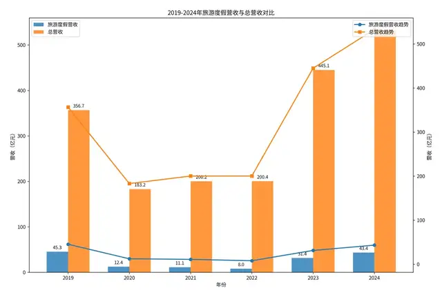 縱覽攜程近五年的營收走勢,旅游度假板塊至今仍未觸及2019年的45億元高點,五年復(fù)合增長率為負。同期集團整體營收已經(jīng)從356.66億元增長到532.94億元,五年復(fù)合增長率達到8.4%。